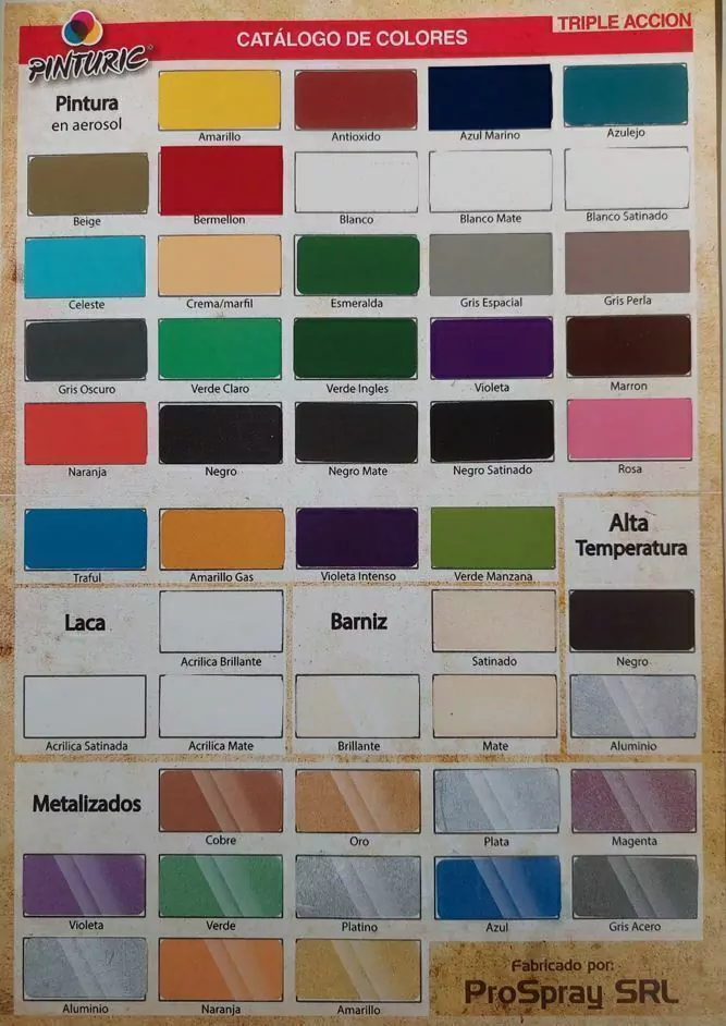AMARILLO - AZUL MARINO - AZULEJO - BEIGE - BERMELLON - CELESTE - CREMA - MARFIL - ESMERALDA - GRIS ESPACIAL - GRIS PERLA - GRIS OSCURO - VERDE CLARO - VERDE INGLES - VIOLETA - MARRON - NARANJA - ROSA - TRAFUL - AMARILLO GAS - VERDE MANZANA